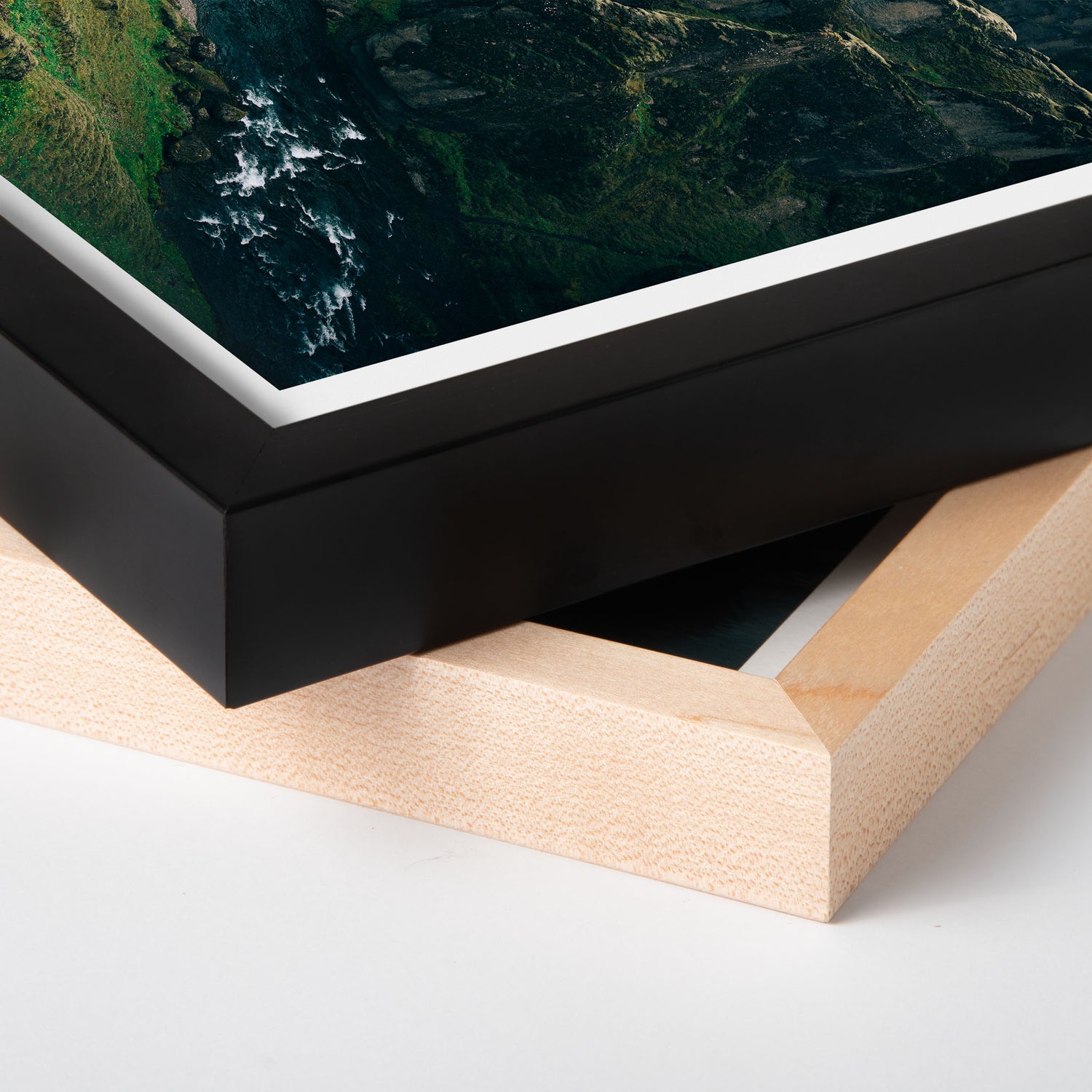 My frames are made from real walnut, maple, and pine — never veneer or imitation wood. Solid wood ensures longevity, stability, and that unmistakable fine-art feel.
