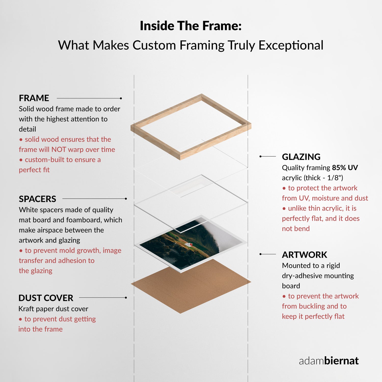 Framed without a mat, using custom-made white spacers — the same approach used by top galleries and museums displaying contemporary fine art photography. Many collectors who once preferred traditional mats now say they’d never go back.