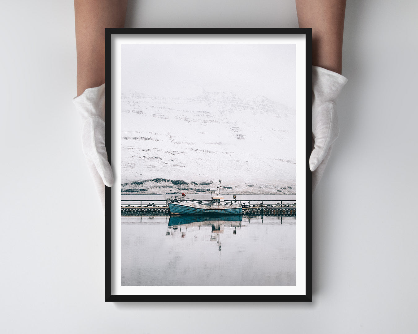 Museum-quality fine art piece (hand-signed in pencil, with a certificate of authenticity) by Adam Biernat, an award-winning fine art photographer published in the top Icelandic magazines. It features an old blue rustic wooden fishing boat moored by the fjord of Seyðisfjörður in Iceland.