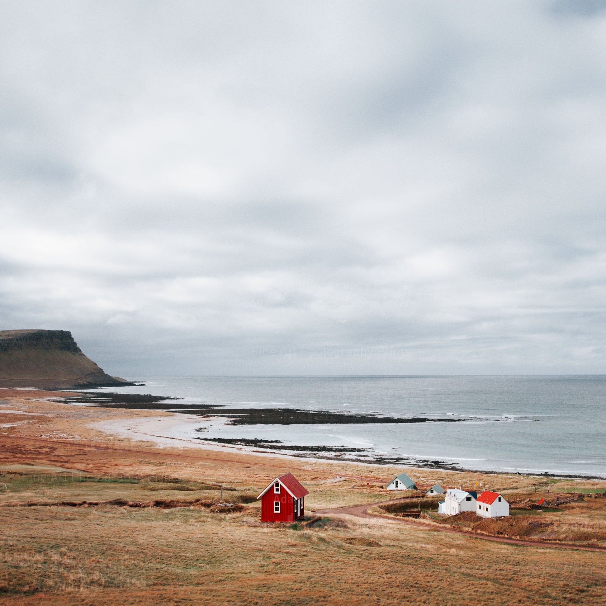 The coastline stretched endlessly beneath a heavy northern sky. A few houses stood scattered across the golden fields — the red one glowing softly, a quiet accent of life against the muted landscape. Beyond them, the sea shimmered with restraint, as if it too was holding its breath.