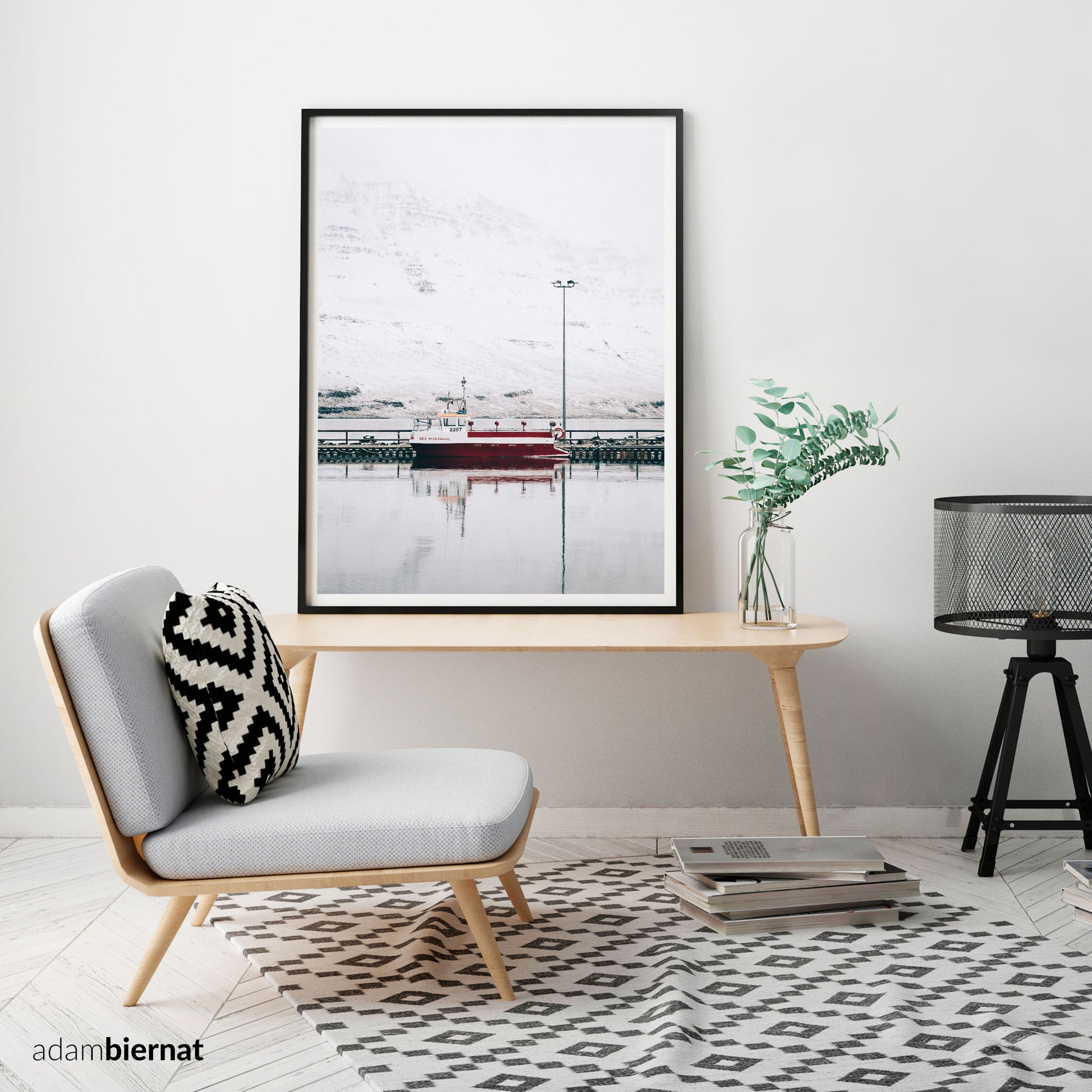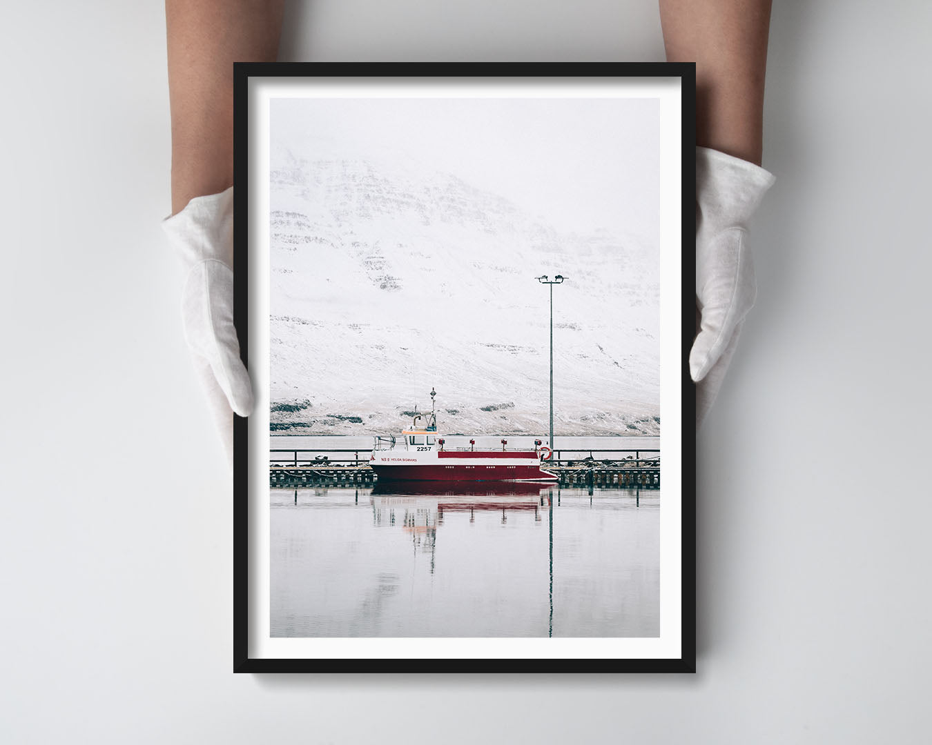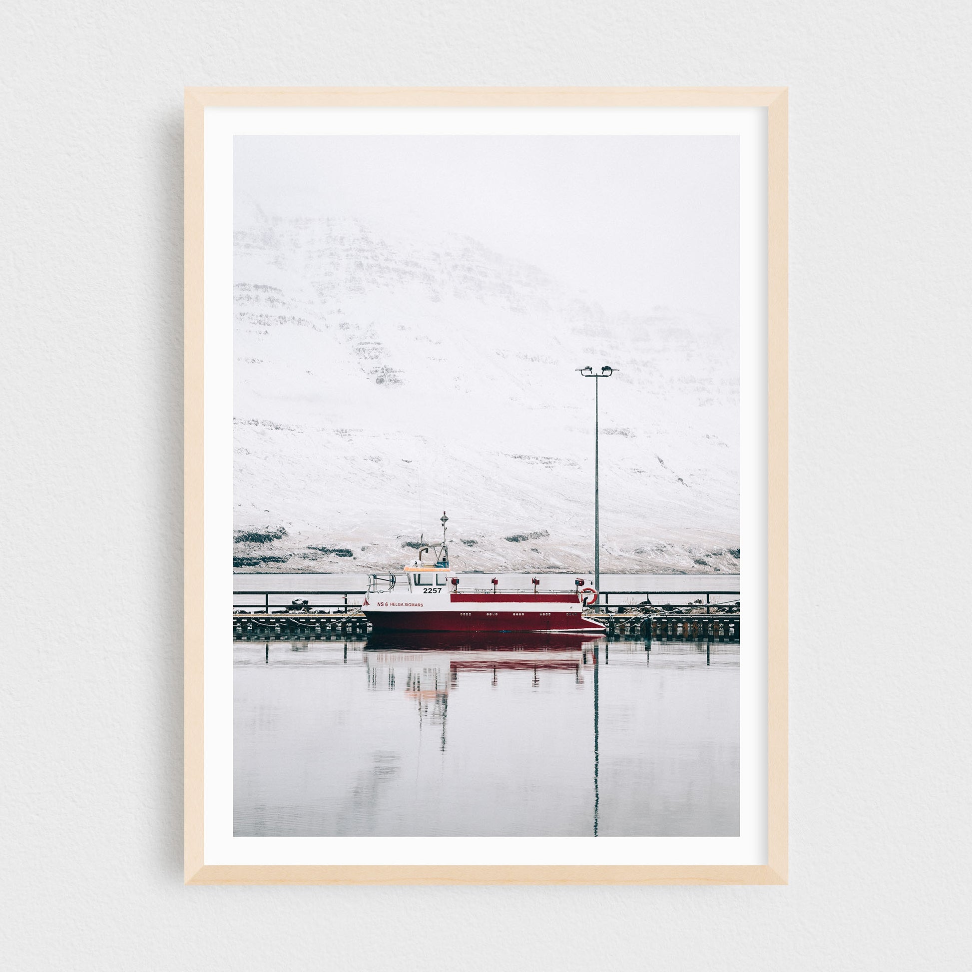 The morning I created this piece, the fjord was silent — the kind of silence that makes you hold your breath without realizing it. Fresh snow had fallen overnight, softening the world to shades of white and gray. The red fishing boat stood alone at the pier, its reflection so clear it seemed painted on the surface of the water.