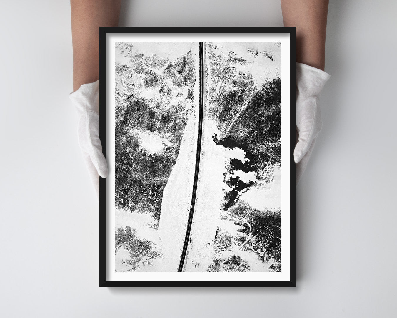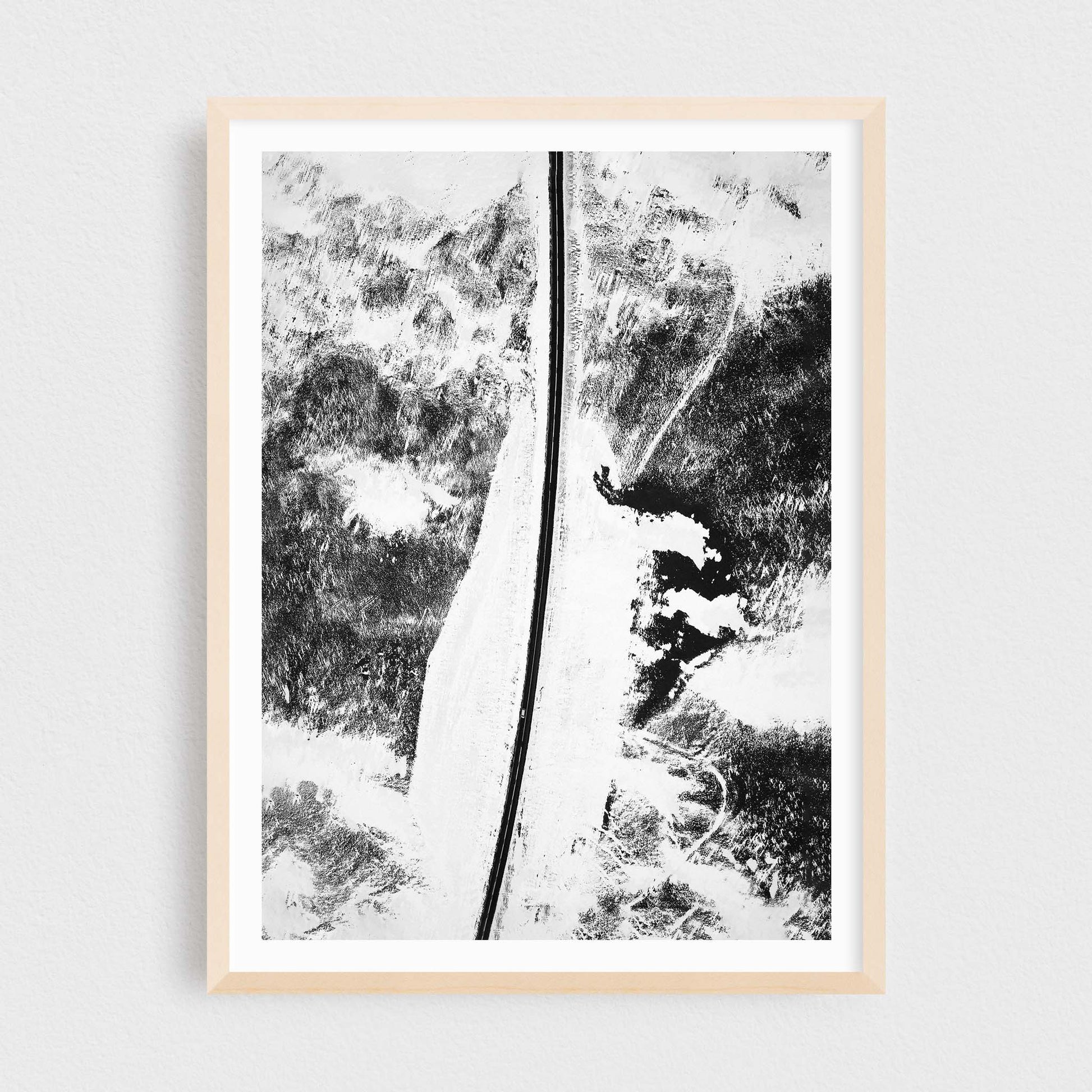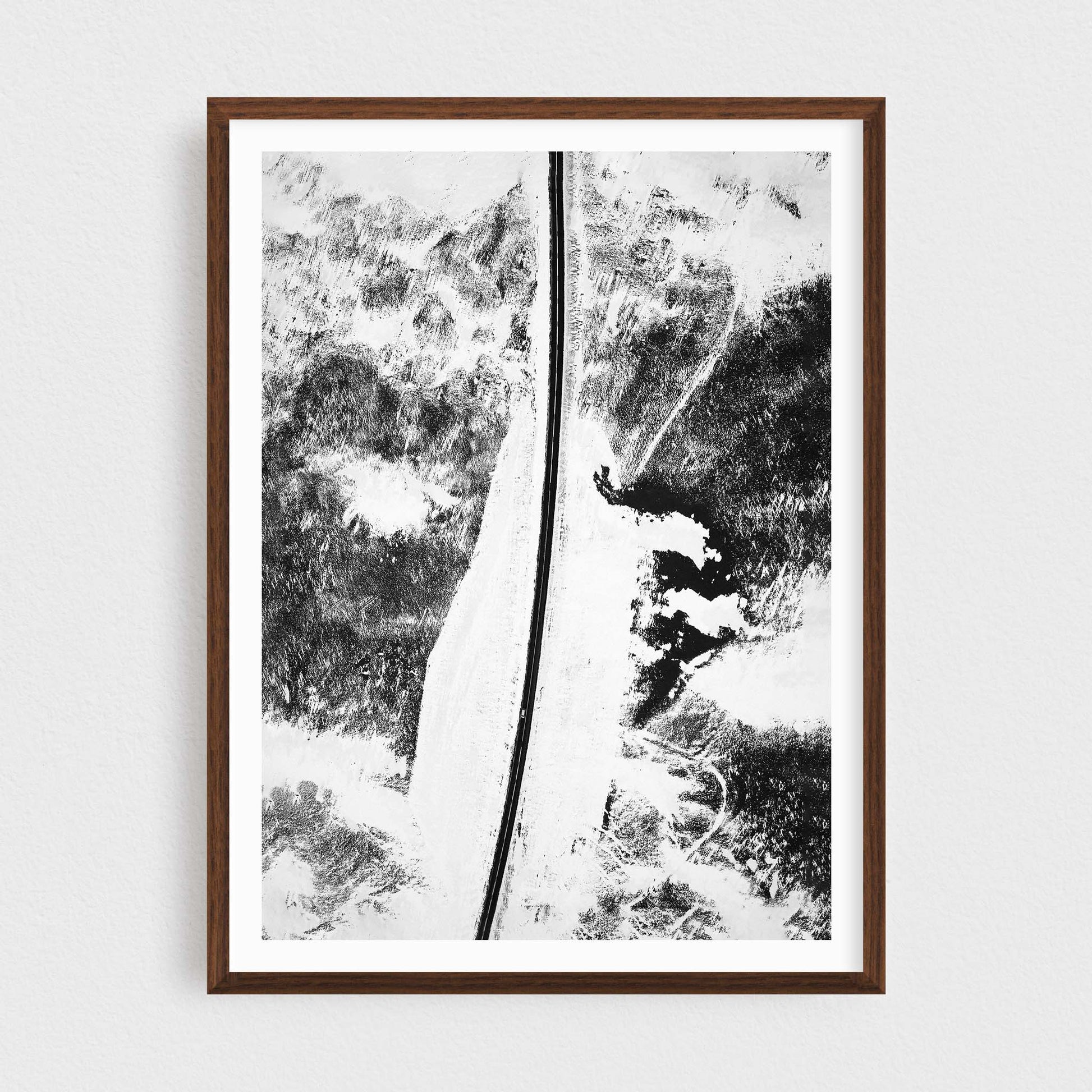 I created this photograph in October 2018, near the end of one of my six-month stays in Iceland. The first snow had just fallen, softening the rough volcanic landscape into something almost ethereal. From around 650 feet above the ground, the world below felt stripped down to its essence — black, white, and still.