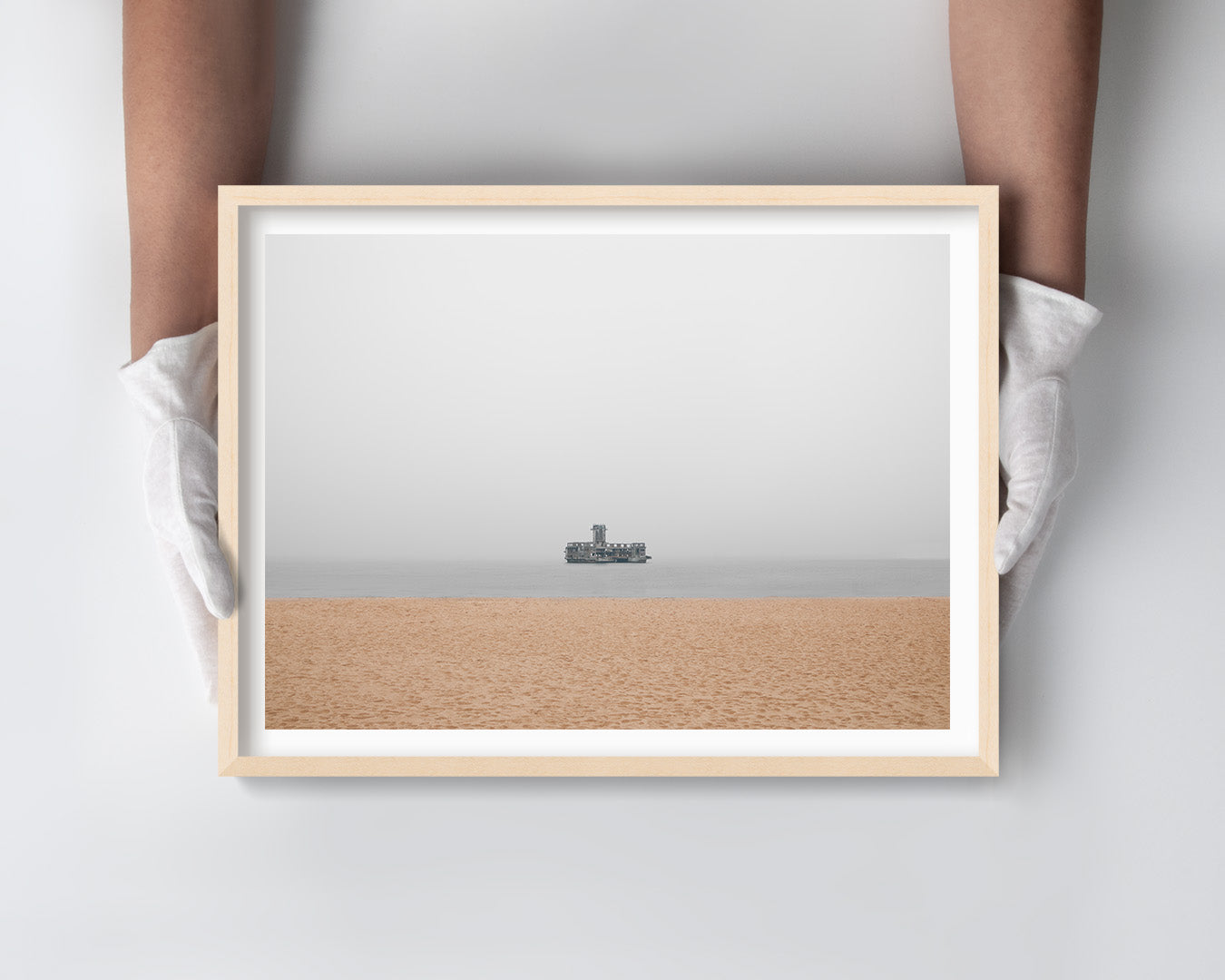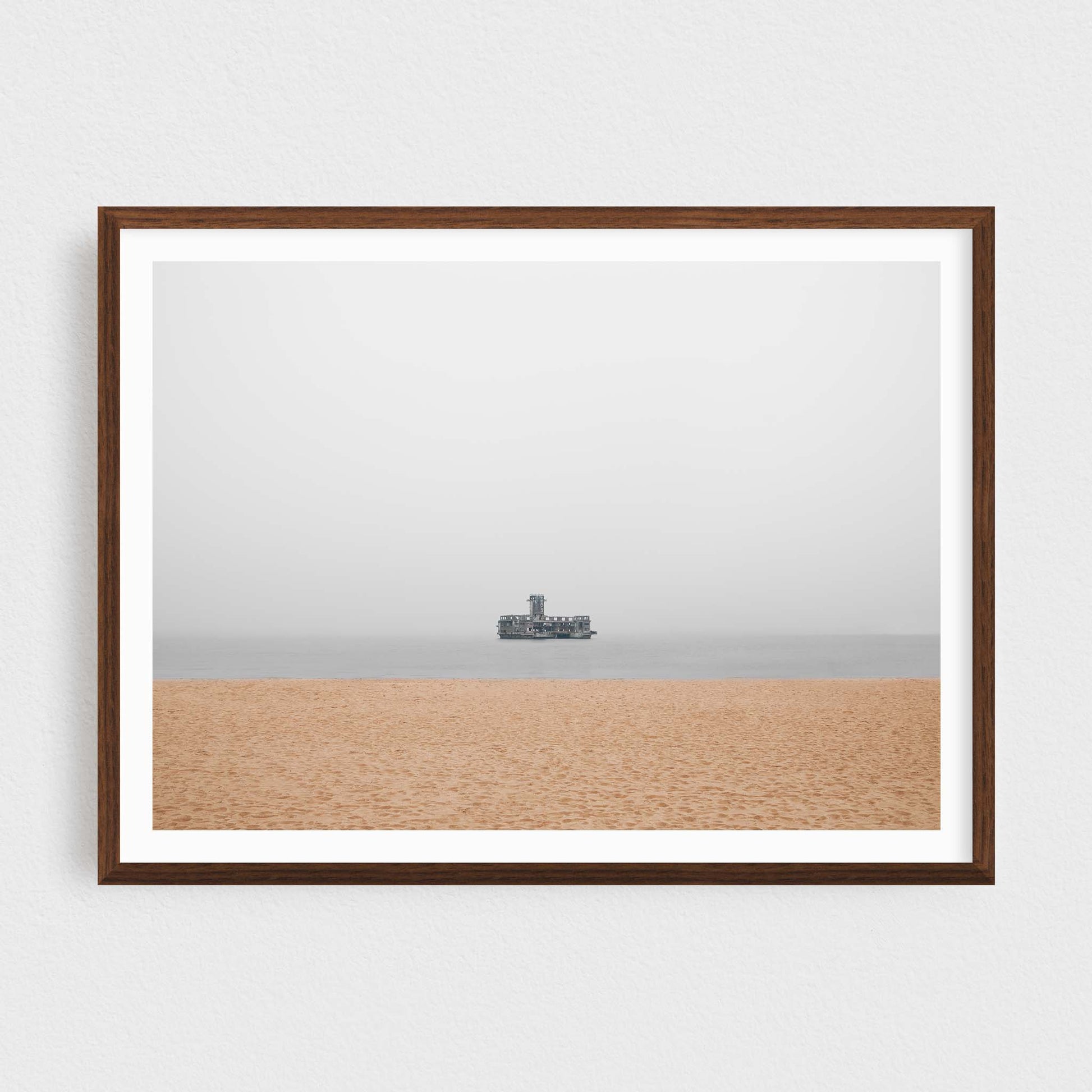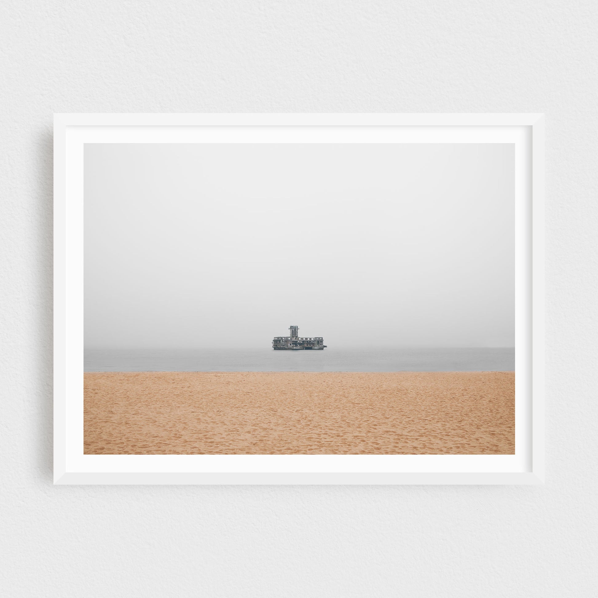 A ghostly structure floats on the horizon — half-dream, half-memory. A remnant from a darker time, standing silent in the sea.