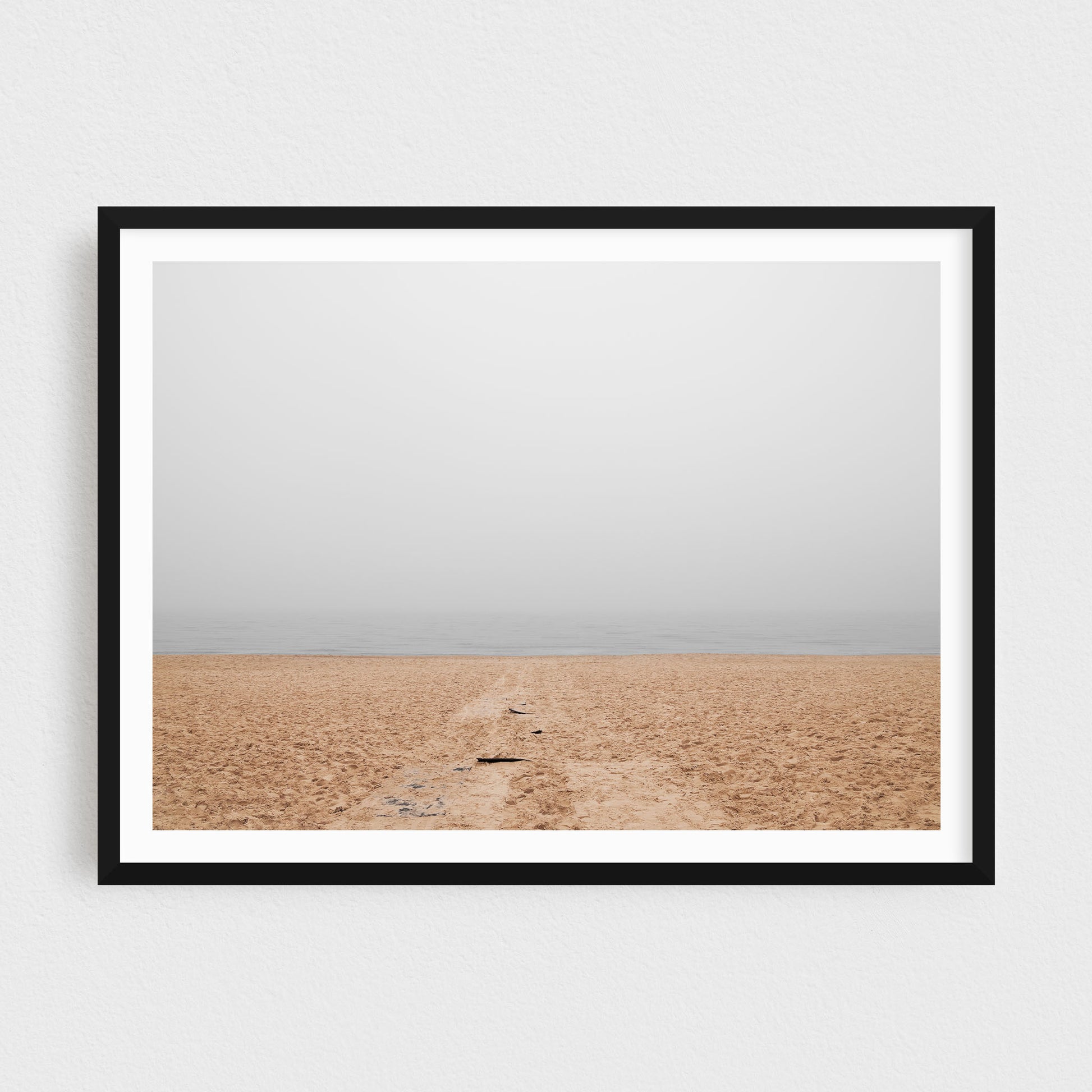 A faint trail cuts through the sand, leading toward the sea and then vanishing into the mist. Scattered remnants lie abandoned along the path, like fragments of something once built, now forgotten.