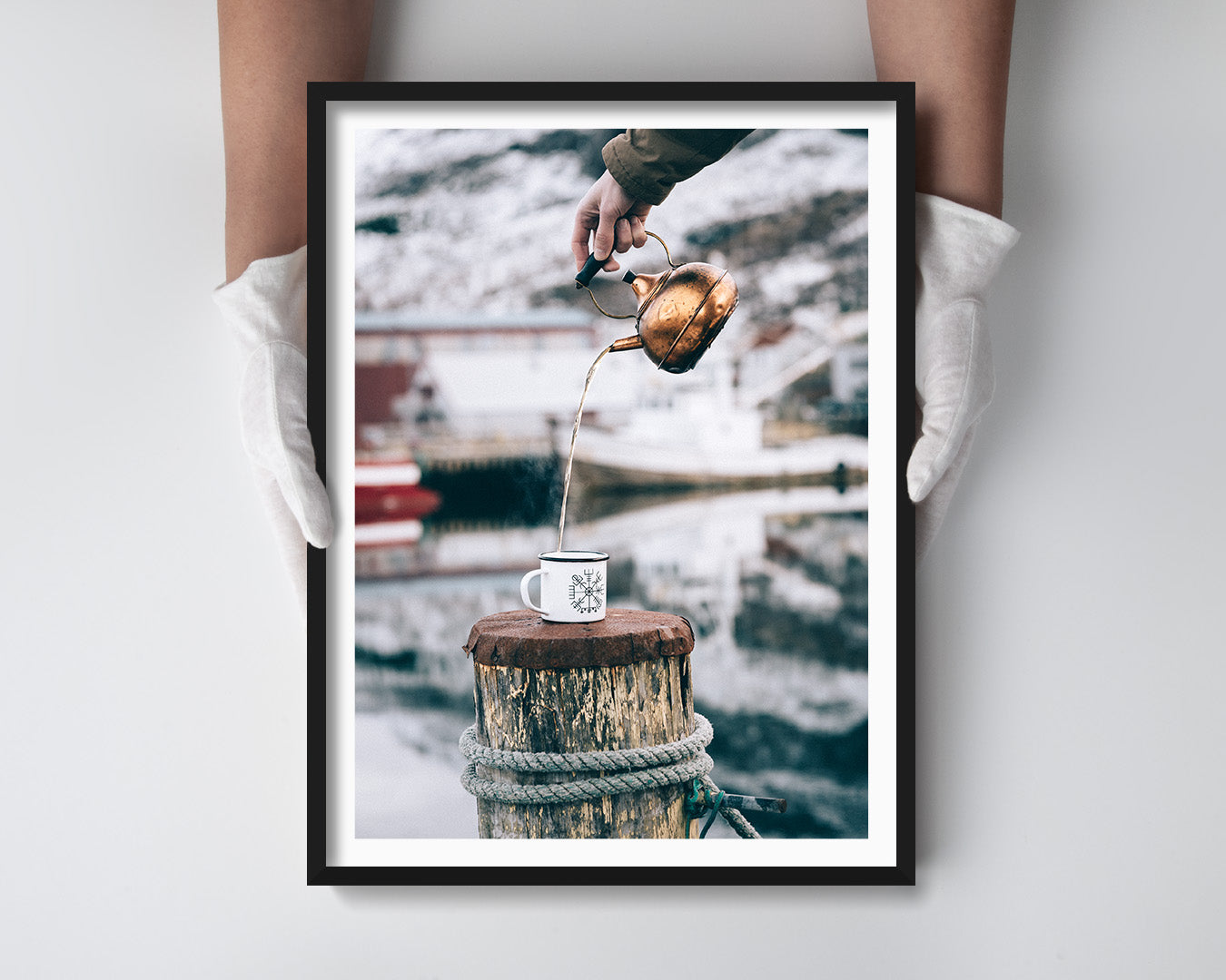 Museum-quality fine art photograph (hand-signed in pencil, with a certificate of authenticity) by Adam Biernat, an award-winning fine art photographer published in the top Icelandic magazines. It features outdoor teatime by the fjord of Seyðisfjörður in Iceland in winter.