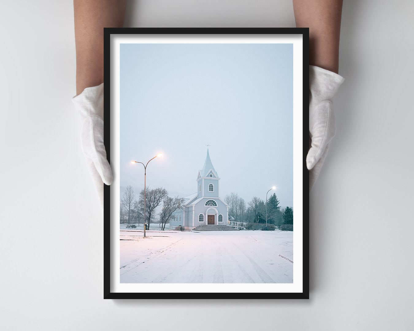 Evening settled softly over Seyðisfjörður, in the remote East Fjords of Iceland. Fresh snow muffled every sound, and the air glowed with that faint blue light that lingers just before nightfall. The church stood quietly at the heart of it all — its pale façade mirroring the sky, its warmth barely touched by the cold.
