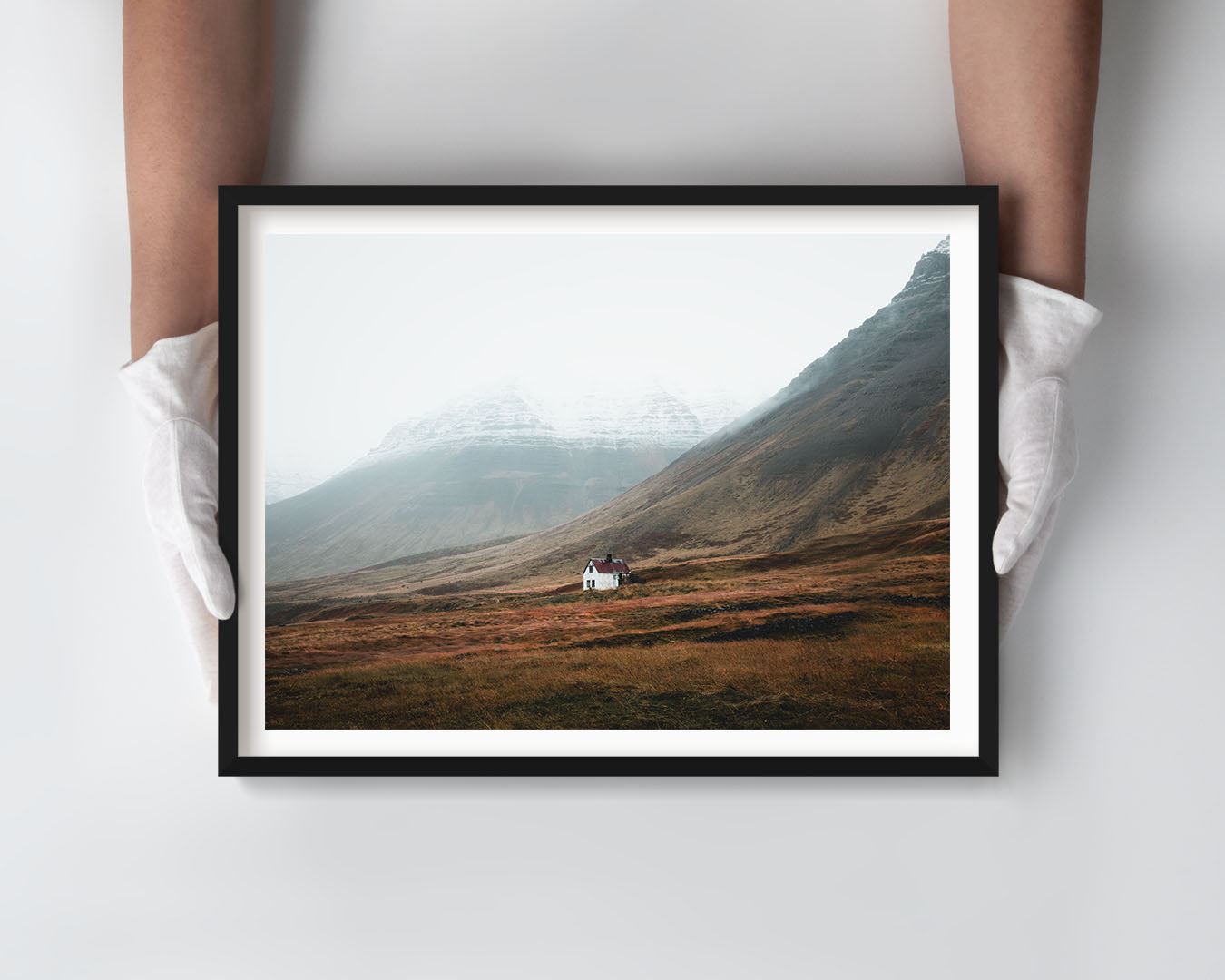 Museum-quality, custom-framed fine art piece (hand-signed in pencil, with a certificate of authenticity) by Adam Biernat, an award-winning fine art photographer published in the top Icelandic magazines. It features a lonely house located in spectacular mountain scenery in the Westfjords, Iceland.
