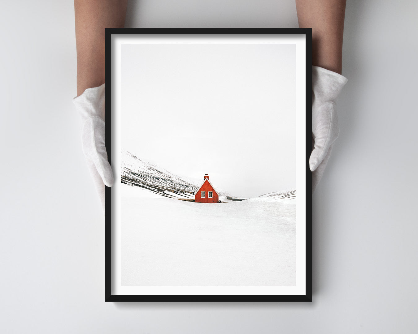 Museum-quality fine art piece (hand-signed in pencil, with a certificate of authenticity) by Adam Biernat, an award-winning fine art photographer published in the top Icelandic magazines. It features a rustic red mountain cabin in winter in Iceland.