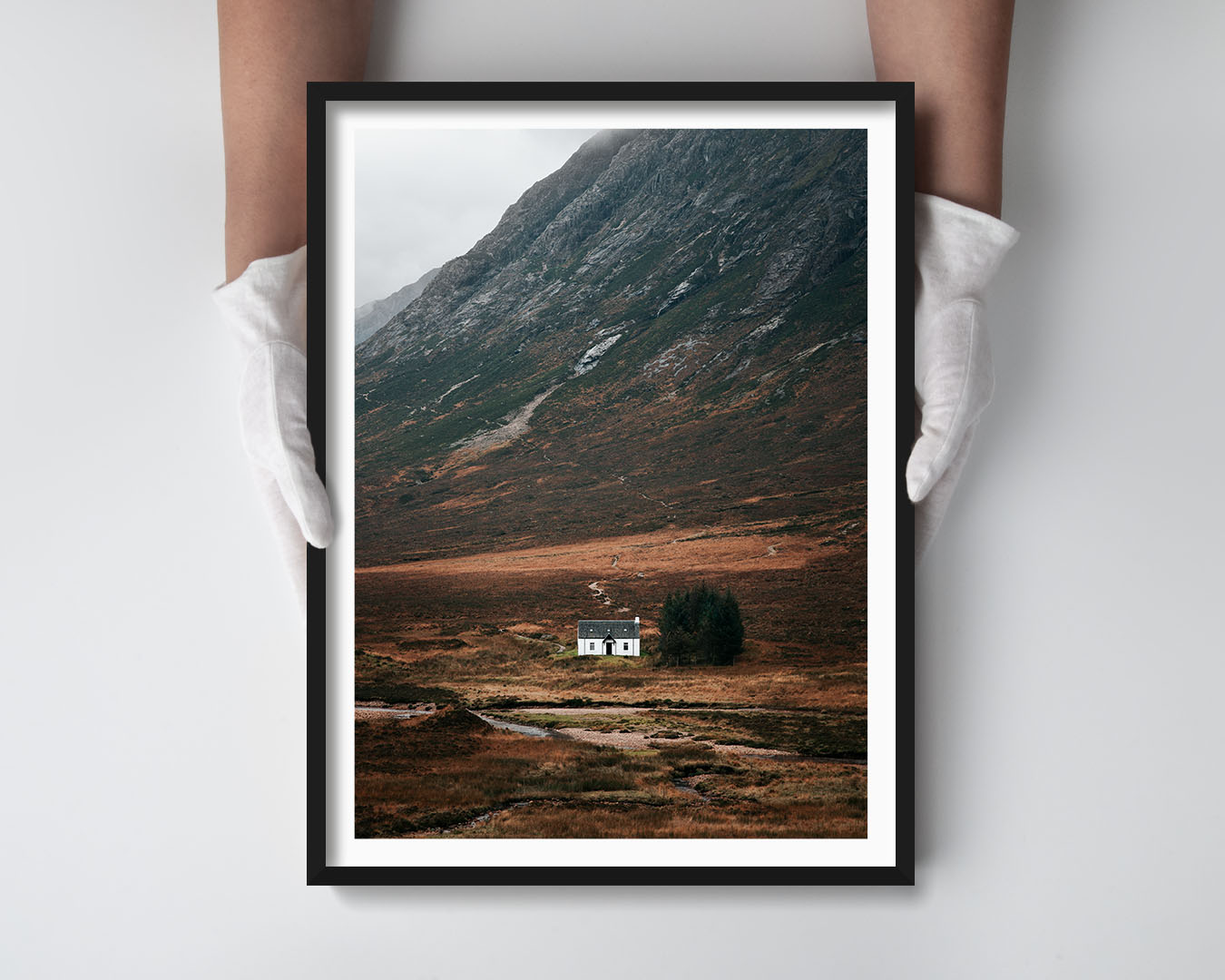 Museum-quality fine art piece (hand-signed in pencil, with a certificate of authenticity) by Adam Biernat, an award-winning fine art photographer published in the top Icelandic magazines. It features a lonely white cottage in Glencoe, Scotland, showcasing the stunning beauty of the Scottish landscape.