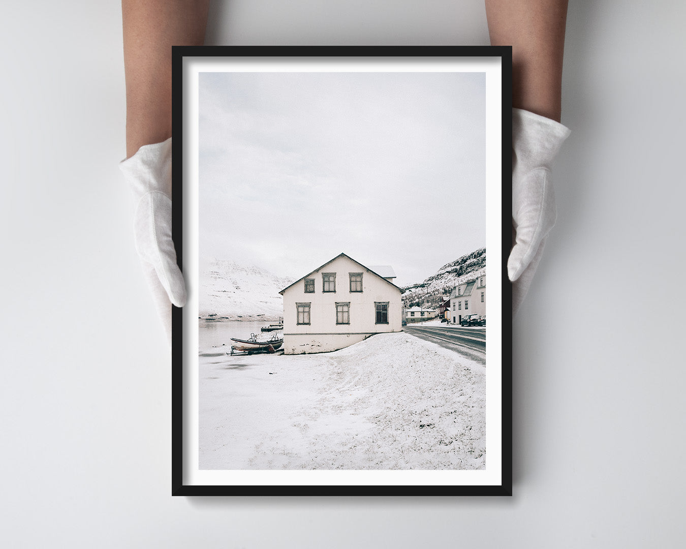 Museum-quality fine art piece (hand-signed in pencil, with a certificate of authenticity) by Adam Biernat, an award-winning fine art photographer published in the top Icelandic magazines. It features a white, rustic Icelandic house standing by the fjord in the small fishing town of Seyðisfjörður.